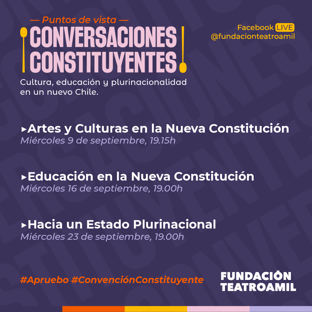 Esta serie de encuentros virtuales se transmitieron en vivo a través de la cuenta de Facebook de Fundación Teatro a Mil, teniendo como punto de inicio el miércoles 9 de septiembre, a las 19.15 horas, con el panel Artes y culturas en la Nueva Constitución, moderado por el actor y director de teatro Héctor Morales, y en el que participaron representantes de distintos ámbitos del campo cultural como el dramaturgo, director y Premio Nacional de Artes de la Representación, Ramón Griffero, la destacada artista visual Voluspa Jarpa, el Doctor en Estudios Culturales Tomás Peters, la Directora de Fundación Saber Futuro, Paula Espinoza, y la directora general de Fundación Teatro a Mil, Carmen Romero. En la ocasión se abrieron preguntas en torno a cómo garantizar los derechos culturales a toda la ciudadanía, de qué manera la cultura puede ser reconocida como un bien público o cómo las artes pueden ser pilares para otras dimensiones sociales que permitan mayor convivencia democrática.