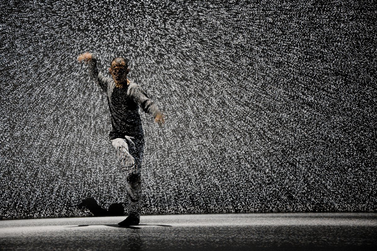 Con reminiscencias de relámpagos, lluvias, tornados y otros fenómenos no lineales existentes en la naturaleza, el conjunto de partículas en el escenario cambia incesantemente de forma y, de vez en cuando, se sincroniza con los datos físicos generados por los movimientos de los músculos de Umeda, con la ayuda de la tecnología de detección. Envuelto en una tormenta abrasadora de píxeles, la fisicalidad del bailarín está fuertemente influenciada por el entorno circundante, a la vez que sus movimientos más sutiles actúan de manera decisiva en todo el universo.