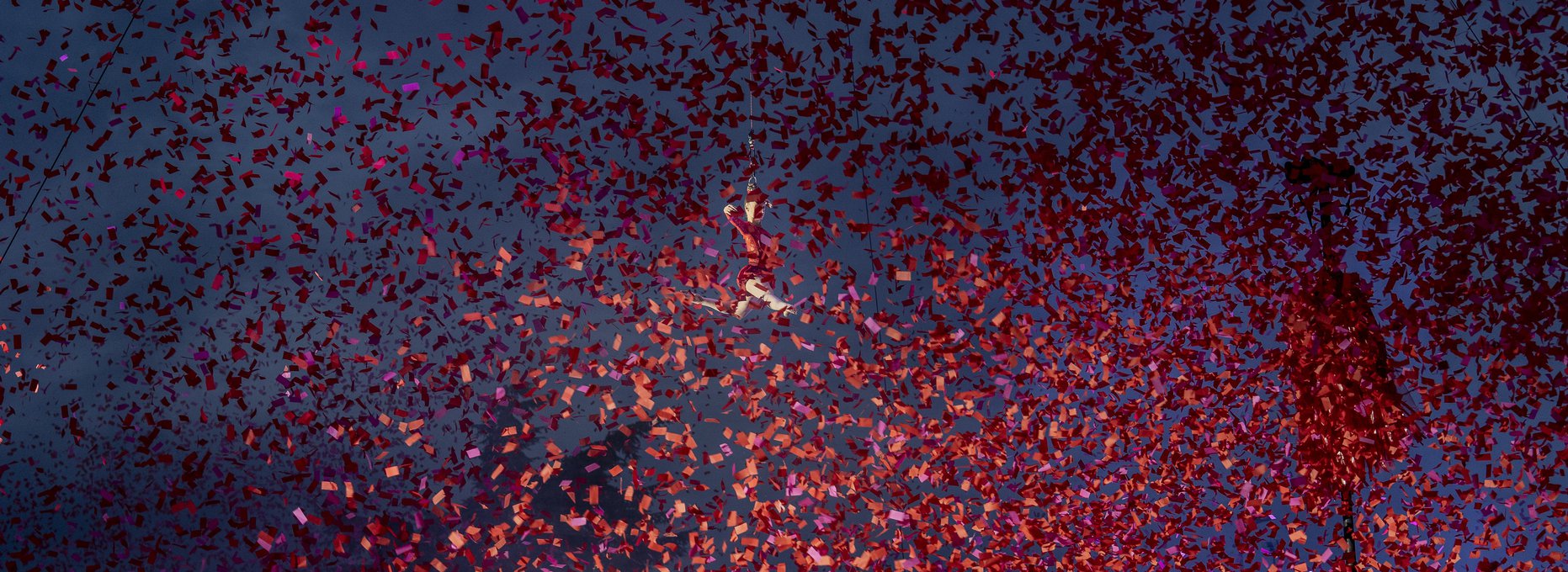 Rouge!, de la compañía francesa de circo aéreo Gratte Ciel, que se presentará en las calles de diversas comunas de la región Metropolitana, invita a artistas locales a participar en un espectáculo electrizante al aire libre, que combina presentaciones en tierra y en aire en una caja de música vertical y dinámica.