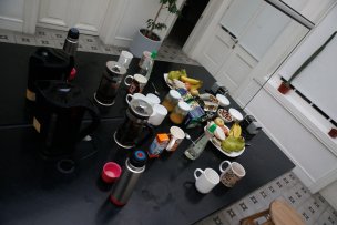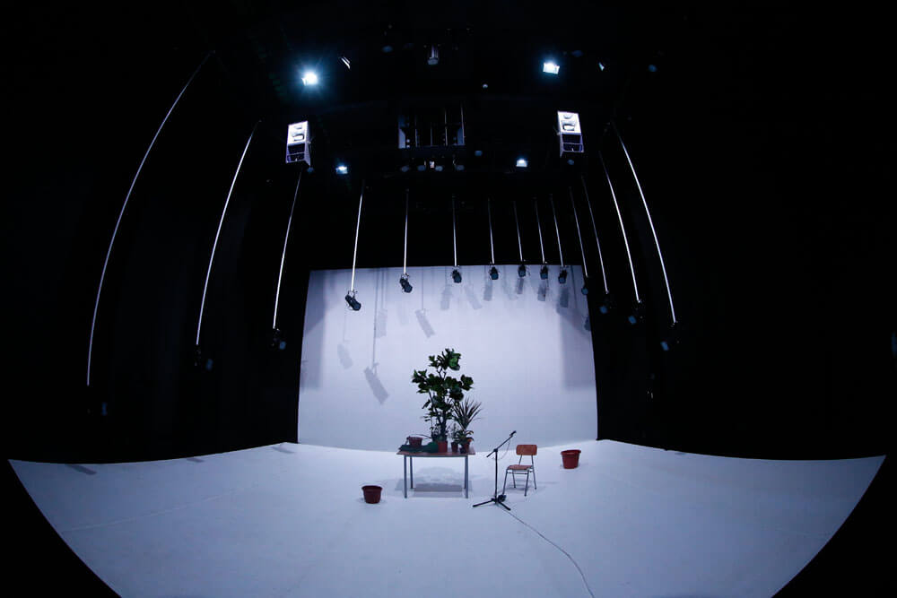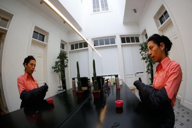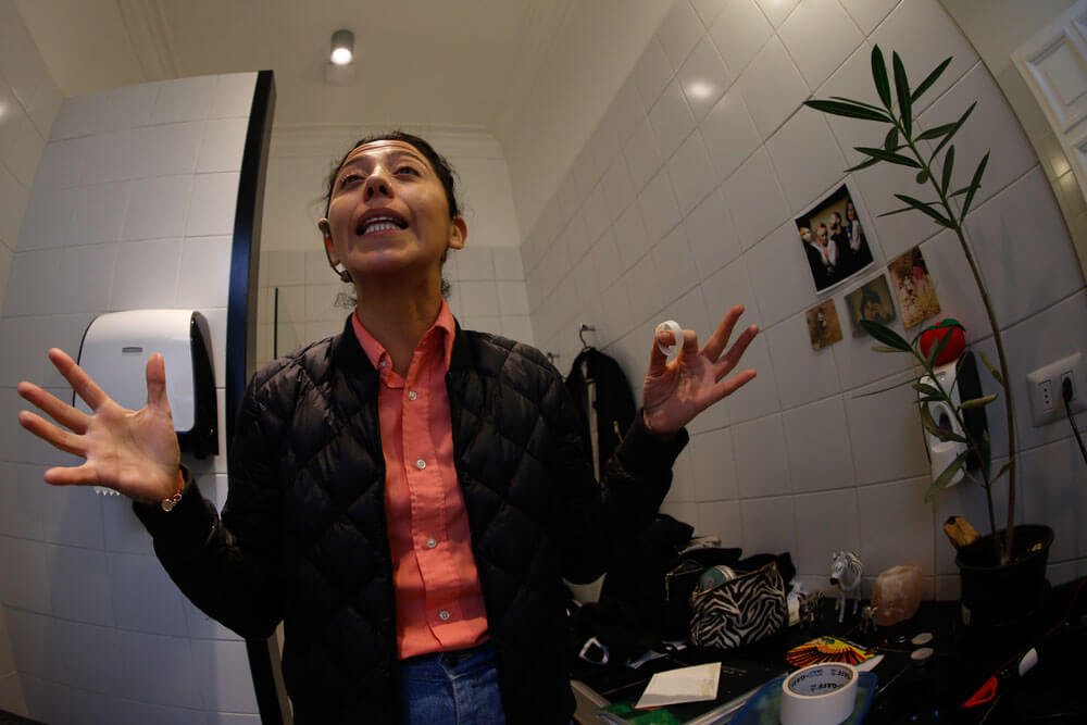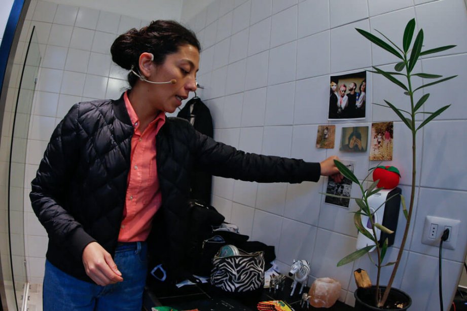 En una sala amplia con un centenar de butacas, la creadora y su equipo están probando las luces que acompañarán a Marcela Salinas, la única actriz que protagoniza la obra. A medida que la directora entrega sus indicaciones, los 14 focos que cuelgan del techo se prenden e iluminan el gran escenario blanco que sólo luce una mesa, una silla y sólo un par de plantas artificiales, de un total de 60 o 70. La luz se apaga, se prende de a poco, a veces de una sola vez, hasta que el lugar queda completamente a oscuras. La directora dice que todo estará listo en 30 minutos.