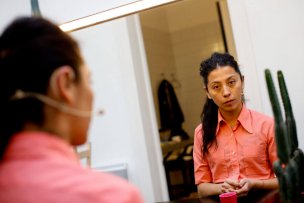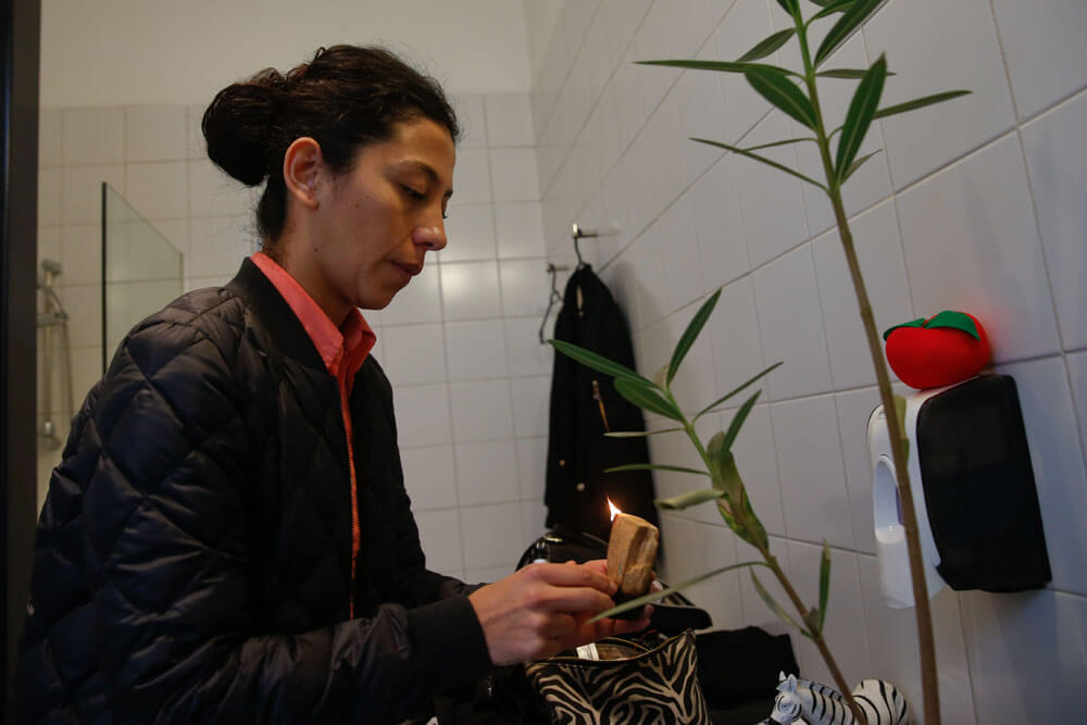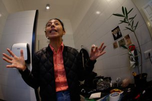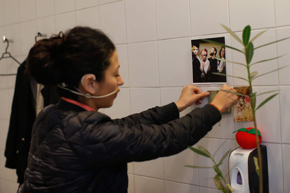 Para ello, prepara su espacio con artículos que le entreguen tranquilidad: fotos de familiares, de un selknam’ y de su proyecto Lágrimas, celos y dudas en la que aparecen junto a un fallecido amigo. En el mesón donde hay maquillaje, un envase con piña natural, también hay un par de figuras de cebras. “Tengo una obsesión con las cebras”, confiesa con una tímida sonrisa. “No sé por qué, pero es algo con los equinos. Cuando chica me gustaban los pegazos, luego los caballos y ahora son las cebras. A veces no me siento bien y me pongo a mirar fotos de cebras para calmarme”, agrega mientras en una de sus manos luce un tatuaje que dice “ZEBRA”.