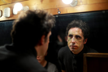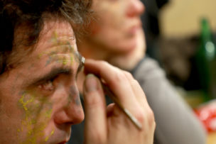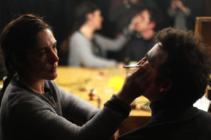 Tomás está inseguro de su maquillaje, la idea es que se vean manchados, y esas manchas tienen muchas interpretaciones, unos pueden verlas como suciedad, otros como emociones, una carga. Trinidad comienza a ayudarlo con el maquillaje y le dice “no Tomás, así no, tiene que ser un poco más sutil”, entonces toma el pincel y termina con el trabajo. Hay mucha complicidad entre ellos, y en el grupo en general, se tratan con cariño y se ríen constantemente.