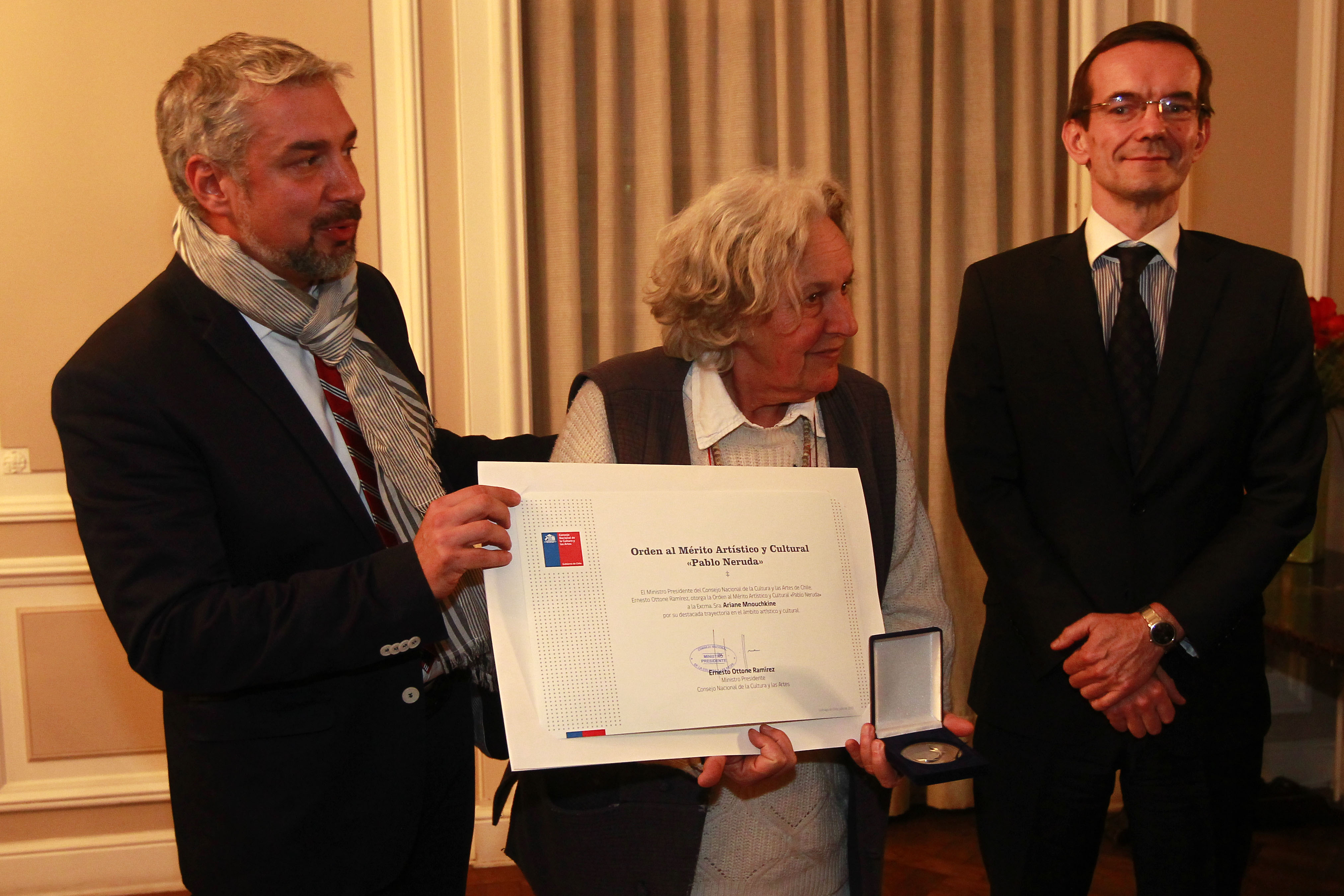 El Ministro de Cultura, Ernesto Ottone, entregó en la Embajada de Francia la Orden al Mérito Artístico y Cultural Pablo Neruda a la directora del Théâtre du Soleil, Ariane Mnouchkine, que se encuentra en Chile por la realización de su primera Escuela Nómade, la cual terminará hoy 24 de julio después de un intenso mes de trabajo junto a 230 artistas (su último capítulo se transmitirá el 28 de julio aquí).