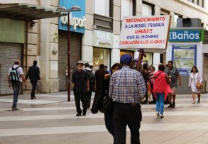 En nuestro camino hasta la penúltima parada nos encontramos con dos agrupaciones manifestándose frente al palacio presidencial con motivo de la conmemoración: mujeres amordazadas con cintas moradas, reclamando contra la violencia machista; y adherentes a la Presidenta Michelle Bachelet entregando su apoyo frente al memorial de Salvador Allende. Con ellos de fondo escuchamos No tengáis miedo de mirarlo a él, y revivimos la visita del Papa Juan Pablo II a Chile y el contingente que lo llevó a La Moneda.