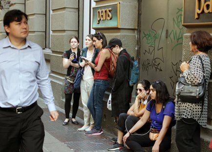 Entre las miradas del resto de los transeúntes, el grupo se mueve nuevamente hasta Paseo Ahumada. Kioskos, farmacias y tiendas comerciales funcionan como escenario para Por el sí, un relato de una adherente a la dictadura de Pinochet; y El Mazinger, una historia narrada por la actriz Paulina García que reúne actores, carabineros, mapuches y prostitutas en la Primera Comisaría de Santiago. “Me pareció un relato muy violento”, agregará más tarde Javiera. “Lo que cuenta sobre lo que pasa en la comisaría es bien impactante, porque hace un relato muy específico sobre los cuerpos, la descripción de la escena y uno se ve afectado por la manera en cómo ella lo describe”.