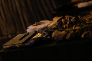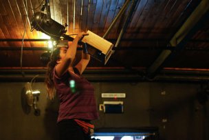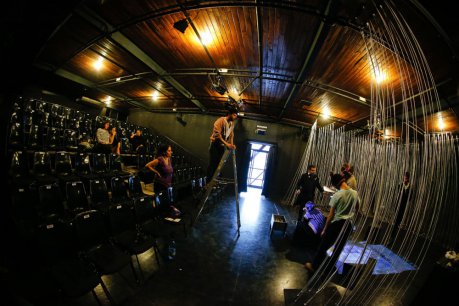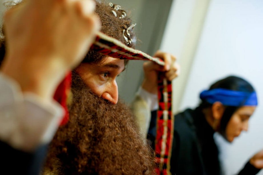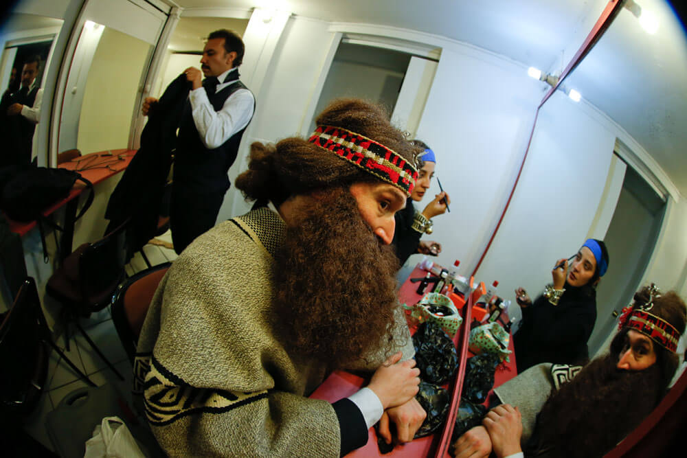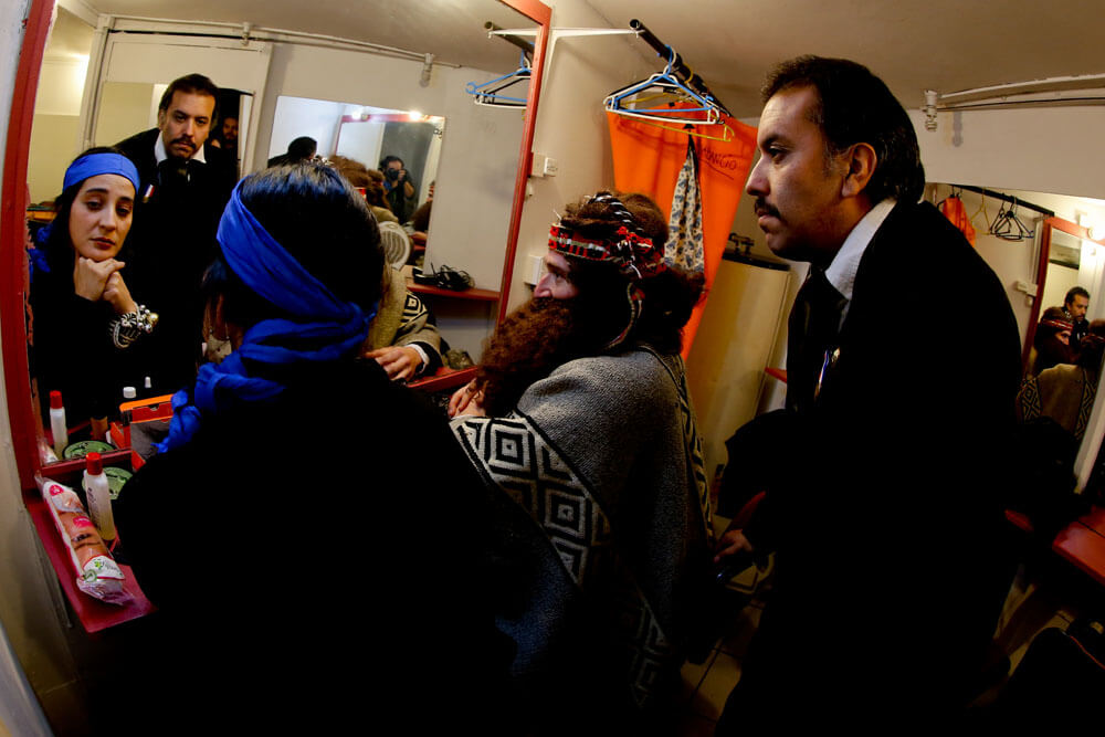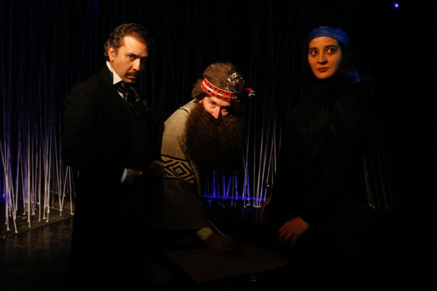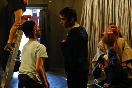 Adentro de la sala, sumidos en un negro absoluto, tres actores repasan textos, posiciones y gestos. El equipo técnico hace lo suyo ajustando focos, probando un proyector y acomodando el vestuario que está al costado derecho del escenario. Roberto Cayuqueo, dramaturgo y director del montaje, se sienta al medio de la sala y les da algunas instrucciones a los actores.