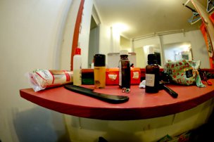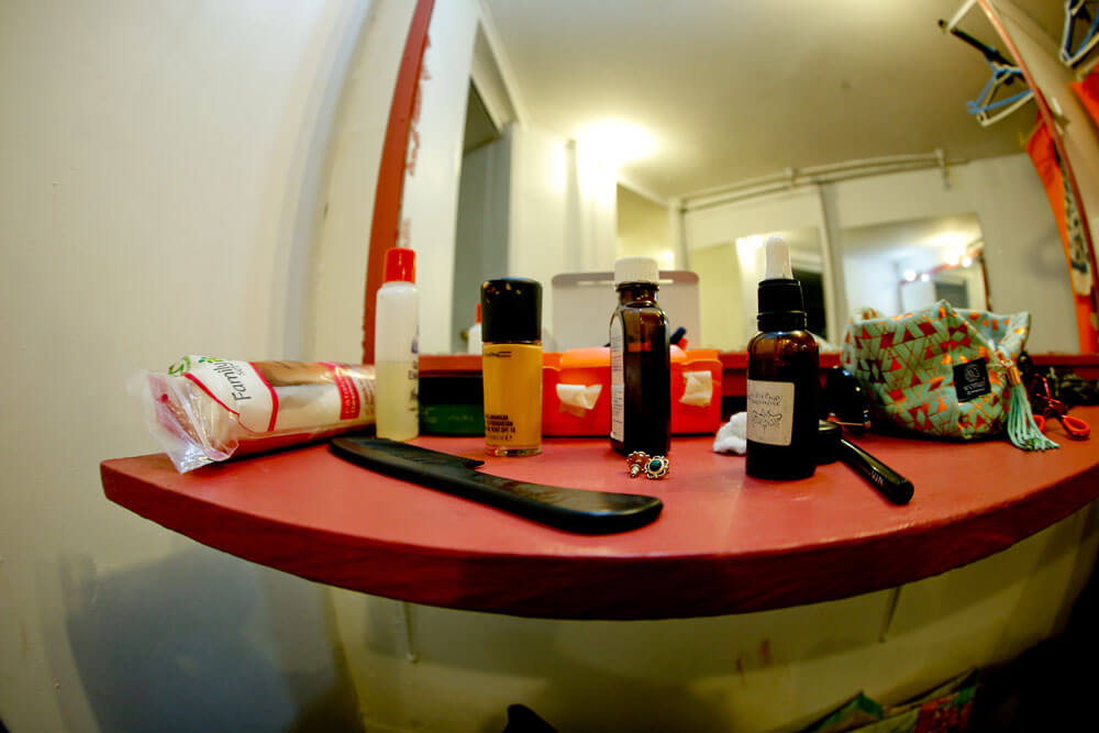 Detrás de las butacas, un pasillo angosto nos lleva hasta el camarín que está justo detrás del café de este centro cultural. “La verdad es que no tenemos un ritual antes de la función”, confiesa Gabriela Arroyo, mientras termina de retocarse el maquillaje en el pequeño espacio que comparte con el resto del elenco: Cristián Martínez, Jorge Ortiz y Simona Díaz Moyano de sólo 11 años.