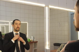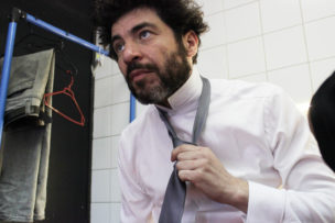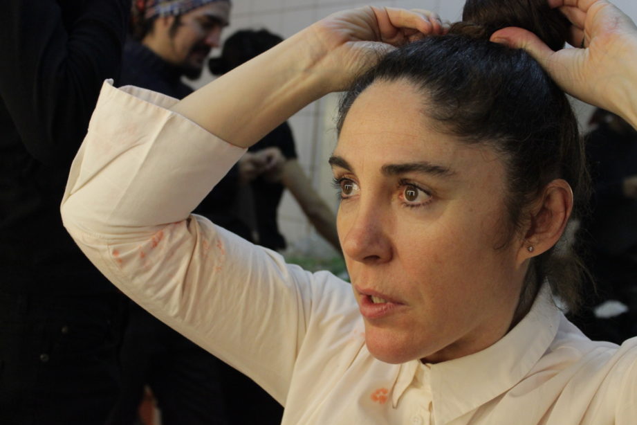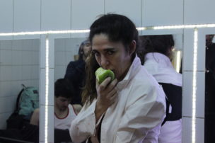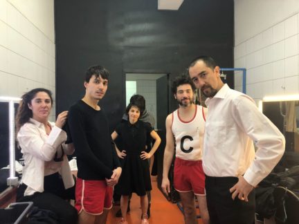 El grupo de intérpretes me recibe de muy buena forma, están en proceso de caracterización y se pasean de un lado a otro. Trinidad González come una manzana y ayuda a Matteo a ponerse el número que le corresponde en la espalda. Lo mismo hace Moisés Angulo con Manuela Martelli, están muy contentos, no se aprecian nervios en sus conversaciones, las tallas van y vienen. Angulo comenta cosas cada cierto rato con voz de presentador de televisión, hacemos unos videos para invitar a la obra y no suelta ese personaje muy divertido, las carcajadas pasan a ser el soundtrack del lugar. El humor es fundamental en este equipo y se expresa en la obra también, a partir de relatos nos muestra una fotografía país que nos da risa y a la vez pudor.