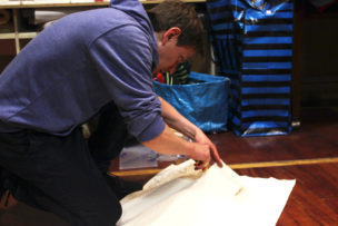 De a poco comienzan a llegar los intérpretes. Entra a la sala Gabriel Cañas, nos saluda y sube la escalera cantando lo más fuerte posible. Yo lo sigo, y entramos a la sala donde se preparan todos. Algunos hacen ejercicio, otros repasan textos mientras planchan sus vestuarios.