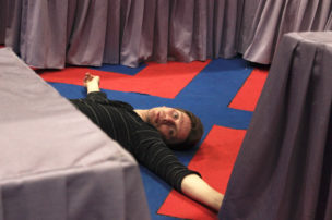 Ahora todas esas escenas que escuché en el camarín se vuelven más reales, veo al elenco dar vueltas por la escenografía, puedo observar a los médicos discutir sobre la llegada de los “amenitas”, extraterrestres que los exponen a lidiar con todos los prejuicios frente a la otredad. Gabriel Cañas no sale del personaje, Pablo Manzi y Franco Toledo ensayan desde el piso, mientras ejercitan, Carlos Donoso transita entre ambas dinámicas y ya estamos a minutos de comenzar la función. Subimos nuevamente al camarín para que el elenco se caracterice definitivamente.