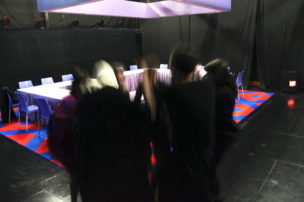 Una vez que terminan arreglarse bajan al escenario donde se encuentran con Andreina Olivarí, juntos hacen un círculo en el que están todos y todas presentes. Olivarí arenga a los intérpretes con todo el ánimo, les entrega confianza y palabras de confort recalcando que no importa qué pase, siempre tienen que dar lo mejor de ellos. Manzi también entrega palabras a sus compañeros y proceden a hacer una especie de ritual de tres partes. Primero frotan sus manos con rapidez y las levantan ágilmente, para terminar con las palmas juntas en una posición específica. Luego bajan tomados de las manos para repetir el clásico “mierda, mierda, mierda” y finalmente se ponen en parejas, golpean sus pechos con las manos en puño y se abrazan fraternamente. Todos pasan por esto con su compañeros y la complicidad del equipo es sobrecogedora. Ahora si están preparados para comenzar con Tú Amarás.