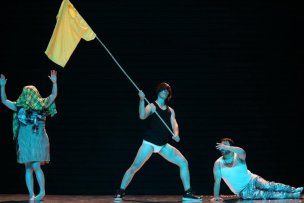 Oropel indaga en el cuerpo entre realidad y apariencia y se sitúa sobre una amplia plataforma de acero que simula una balsa que por momentos parece flotar. “Cuando visualizaba el montaje, visualizaba imágenes y relaciones, no gente bailando, por eso pensé en personas, no en bailarines”, cuenta la directora. Así, en el elenco hay intérpretes que no provienen del mundo de la danza, como el actor Jonathan Inostroza y el actor y director Rodrigo Pérez.